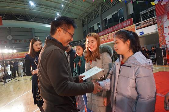 新年晚会中,胡兴灿副院长为第一届国际学生书法大赛中获奖同学颁发证书。
