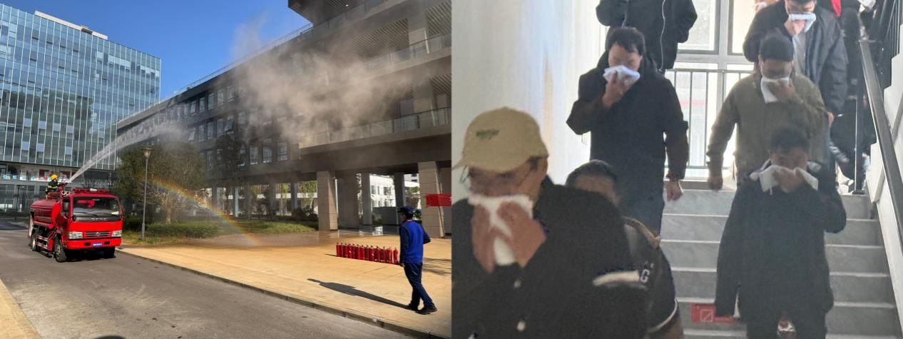 随着消防警报响起,演练在科技园2号楼正式拉开帷幕。工作人员释放烟雾弹,模拟真实火场情景。所有参演人员在疏散引导组的指挥下,迅速反应,弯腰低姿,用湿毛巾捂住口鼻,沿预定疏散路线有序撤离。整个疏散过程紧张有序,参演人员在短时间内全部安全转移至指定集合点。灭火行动组同步使用消防器材对模拟火源进行扑救,充分检验了园区消防设施的有效性和应急队伍的协作能力。