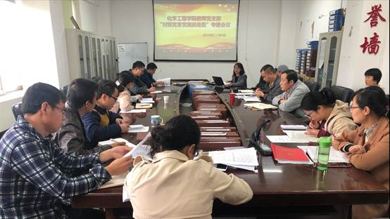 2019年11月9日上午,化学工程学院教师党支部召开了“不忘初心、牢记使命”主题教育对照党章党规找差距专题会议。会议由教师党支部书记刘云花主持,化学工程学院教师全体党员教师参加了会议。