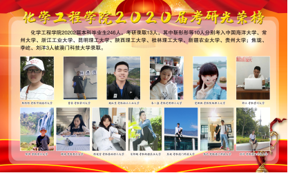 化学工程学院在2020届本科生考研工作中成绩显著,本科毕业生246人,考研录取13人,其中靳彤彤等10人分别考入中国海洋大学、常州大学、浙江工业大学、昆明理工大学、陕西理工大学、桂林理工大学、新疆农业大学、贵州大学;焦珑、李屹、刘洋3人被澳门科技大学录取,录取人数名列全校前茅。