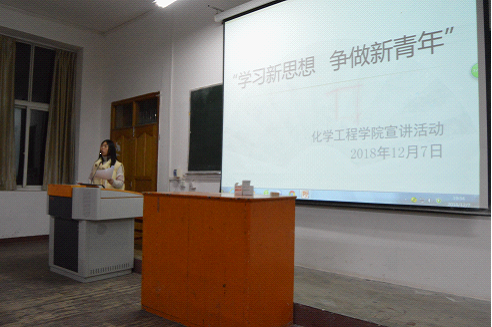 为深入学习贯彻党的十九大精神,习近平新时代中国特色社会主义思想和团十八大精神。12月7日晚,化学工程学院在一教211教室开展“学习新思想,争做新青年”宣讲活动,2017、2018级学生代表到场聆听。