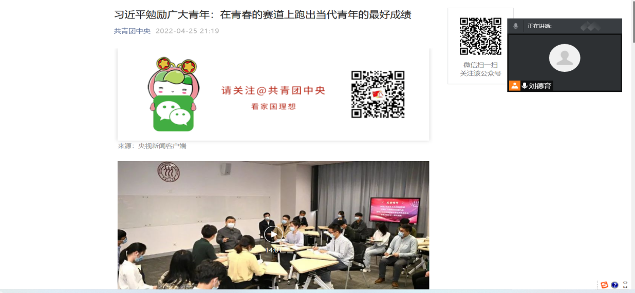 值此五四青年节来临之际,习近平总书记于25日去中国人民大学考察调研并深情寄语广大青年。为贯彻落实习近平总书记考察精神,贵州理工学院化学工程学院团总支学生会主席刘德育于2022年4月30日晚20:00以腾讯会议线上宣讲的方式开展此次思想学习专题会议,化学工程学院团总支学生会全体成员参会。