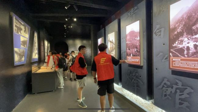 实践小队首先赴第一个实践地点,息烽集中营革命历史纪念馆、息烽集中营旧址开展实践活动。在息烽集中营革命历史纪念馆,同学们通过实地走访,了解到息烽集中营是抗日战争时期国民党军统特务机关设立的专门关押共产党人和爱国进步人士的规模最大、管理最严、等级最高的一所秘密监狱,与重庆白公馆、江西上饶集中营同为抗战期间国民党设立的三大集中营。通过参访学习、和历史纪念馆工作人员交流,同学们对这段时期的历史有了更具体深入的了解;并在纪念馆工作人员的指导下,对来馆参观游客发放宣传资料、发放回收讲解器耳机、引导指引等工作,为参观的游客提供便利。