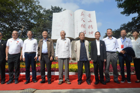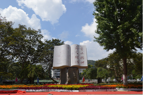 上午10点整,天池旁,由校友们捐赠的纪念石落成仪式开始,在众多校友的见证下,帷幕被缓缓拉开,纪念石之上是一本翻开的石书,与同样形状的主楼遥遥相对,书上刻着学校的平面图,并写着“贵工精神,薪火相传”八个大字。