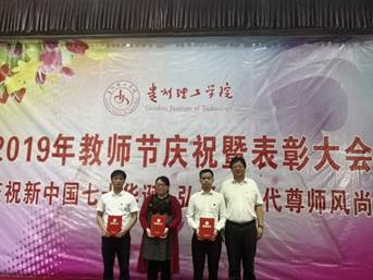 9月10日上午,恰逢第35个全国教师节来临之际,贵州理工学院在逸夫报告厅举行庆祝2019年教师节暨先进表彰大会,会上表彰了一批先进个人,我院教师唐安江、柏松、刘莹、冯双共4位教师榜上有名: