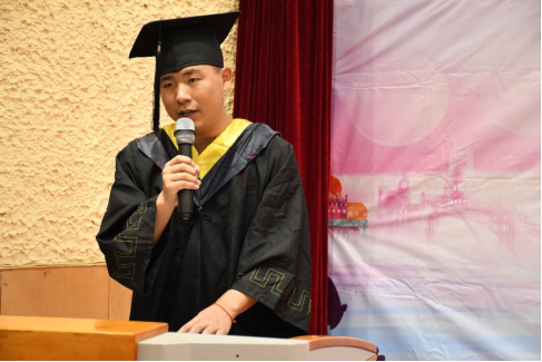 教师代表葛武杰对全体毕业生说:同学们,今天坐在这里,代表着你们已经顺利完成了人生的一个小目标,同时也将开启人生新的征程。作为教师代表,我想和大家分享几点:1.常怀感恩之心;2.要多读书;3.管理好自己的情绪;4.一定要有远大理想并付诸实践。最后,愿同学们都能怀感恩心、以书籍为修身、处事之法宝、以情绪掌控者的姿态来面对未来。愿同学们前程似锦!