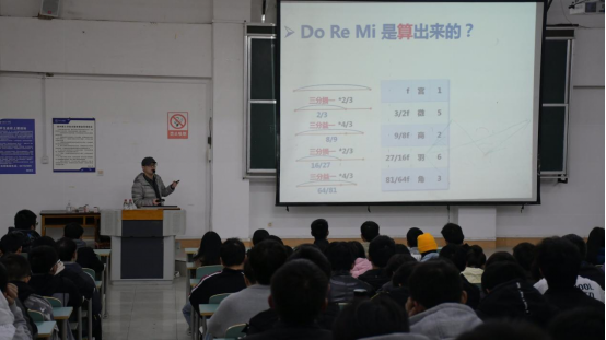 罗孜以“科学技术与人文艺术从来就不是‘风马牛’的关系”、“艺术在工程技术领域的应用”两个话题,引入本次讲座。紧接着,他从“音乐中的数字”、“音符与数字”、“色彩中的数字”三个板块开始讲解。他现场为大家展示了“Do Re Mi”是如何通过数字运算出来的,并介绍了音律的发展史以及各阶段音律改进的原理及优缺点。通过研究巴赫音乐作品中的规律揭示巴赫卡农隐藏的神奇逻辑,他进一步阐述了音符与数字之间的联系。最后,在色彩能够表达情绪在这一板块,罗孜向大家介绍了给颜色编号的三种方式,并就加法三原色与减法三原色做出区分。