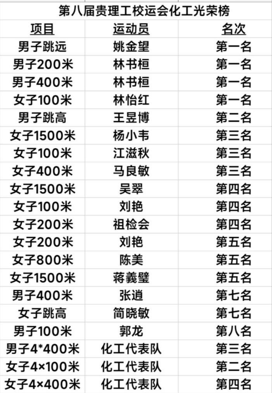 4月13-14日,贵州理工学院第八届运动会在贵安校区与蔡家关校区隆重举行。在化工健儿们的热血拼搏,团结合作下,化学工程学院取得了本次校运会团体总分第二名的好成绩!