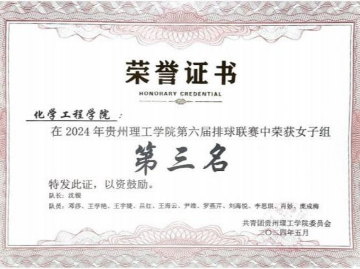2024年5月20日,我校举办的第六届排球联赛在激烈的比拼中落下帷幕,化学工程学院女子排球队斩获季军!