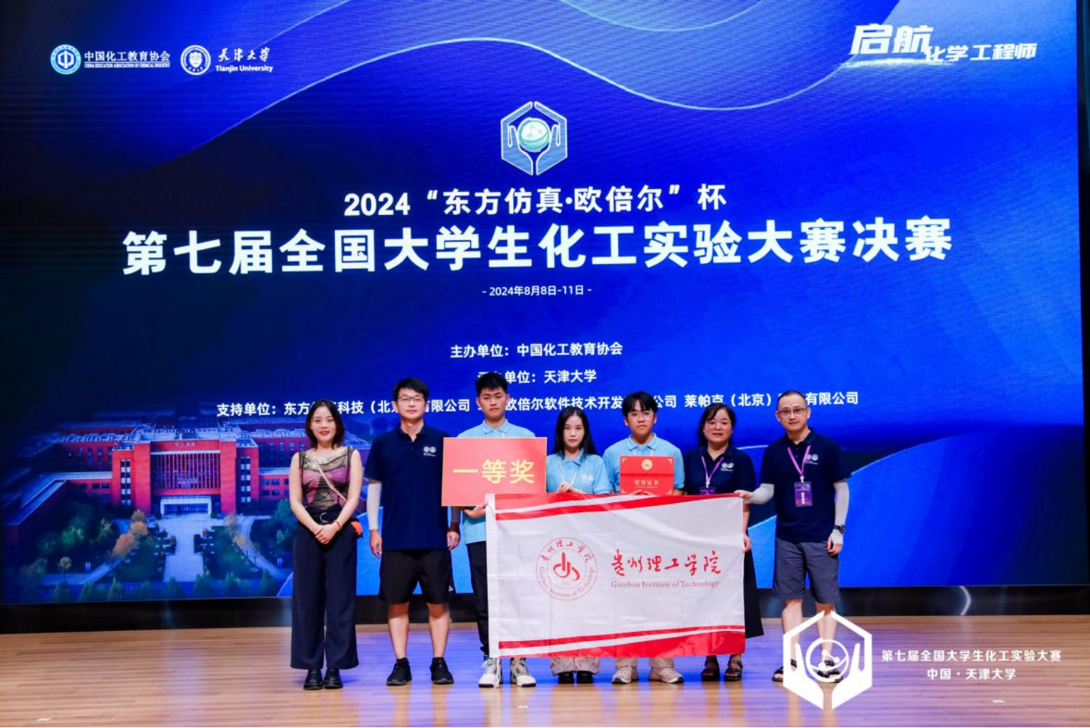 8月8日至11日,由中国化工教育协会主办、天津大学承办的“东方仿真∙欧倍尔”杯第七届全国大学生化工实验大赛总决赛在天津大学北洋园校区举行。贵州理工学院化学工程学院2021级学生王孝平、付会单、毛兴宇3名同学组成的参赛队荣获团体一等奖!这是我校化工学子首次冲入该赛事的全国总决赛,也是贵州省高校在该赛事中首次获得全国一等奖。比赛期间,指导教师张妙鹤担任了大赛实验报告撰写监督裁判。