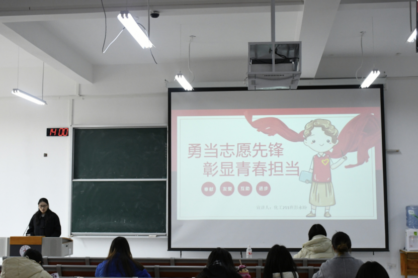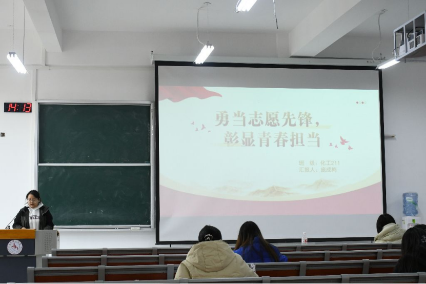 为加强大学生党员管理,发挥党员的先锋模范作用,化学工程学院于11月28日下午在酝知楼126教室举办了主题为“勇当志愿先锋,彰显青春担当”的第十一期初心讲堂。本次活动宣讲人有化学工程学院学生党支部预备党员庞成梅、张熙媛、董莲会、彭永盼。