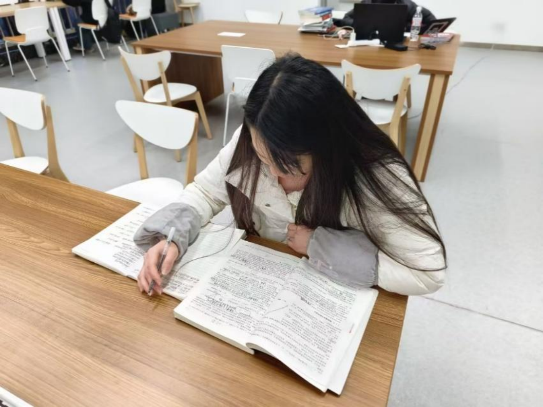当被问及四级备考方法,杨敏从背包里拿出那爬满黑红笔记标注的往年四级真题卷与挤满单词的笔记本。“每天背三个小时单词不是计划,而是自己的底线。”她拿着笔记本笑着说,“把手机关机,用电子表倒计时,背完单词再刷题。”这种近乎苛刻的自律让她在真题训练中正确率大大提升。