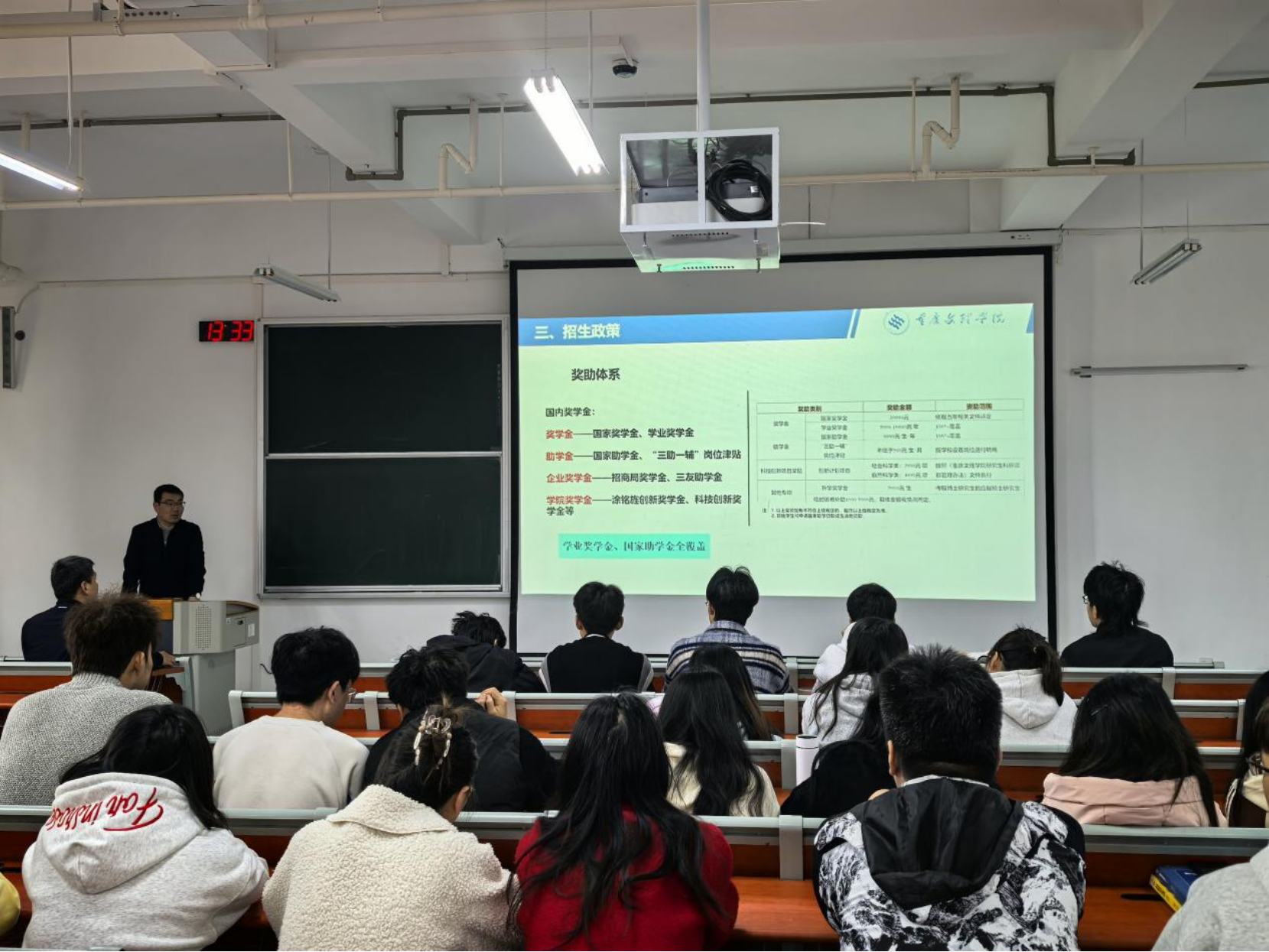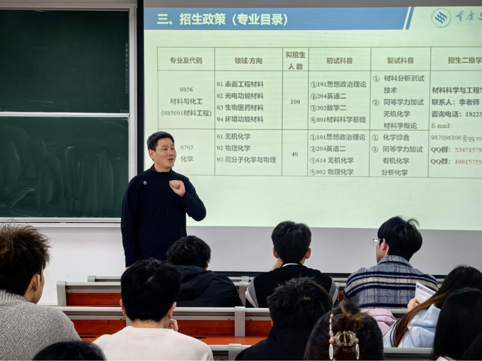 在宣讲中,朱江和翟福强就重庆文理学院材料科学与工程学院的概况,办学定位、特色,学院师资、科研、招生计划、奖助政策及就业前景向大家做了详细的介绍,在场的同学就自己感兴趣的研究生招考问题进行了咨询。