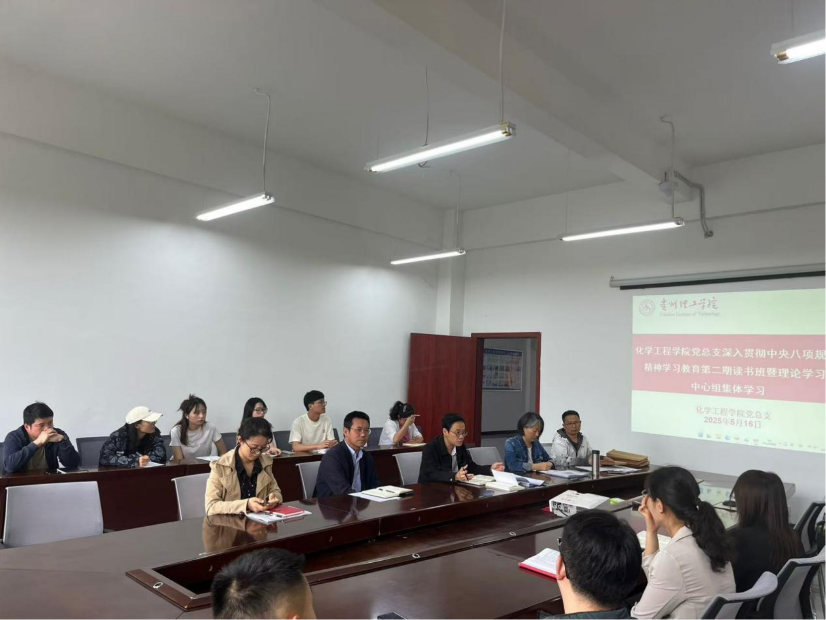 2025年5月16日,化学工程学院党总支深入贯彻中央八项规定精神学习教育第二期读书班在酝知楼562会议室召开,学院领导班子成员、各科室负责人、党员教师参加学习。