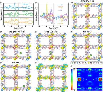 图2. (a) Fe-Ni MOFs、Co-Ni MOFs及Fe-Co-Ni MOFs的总态密度(TDOS)曲线图;(b) Fe-Co-Ni MOFs的分波态密度(PDOS)曲线图;Fe-Co-Ni MOFs在不同间隙位点的优化构型:(c) 24d位(Fe-Ni)、(d) 24d位(Fe-Ni-Co)、(e) 24d位(Co-Ni)、(f) 32c位(Co)、(g) 32n位(Ni);(h) Fe-Co-Ni的三维差分电荷密度图及(i)二维等值线图。