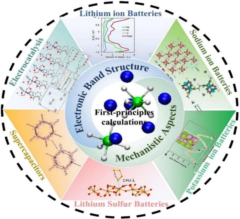 研究人员正日益关注为高性能二次电池和电催化领域寻求先进的电极材料。一种有效的方法涉及基于密度泛函理论(DFT)的第一性原理计算,该方法被用于设计和制备新型电极材料。这种计算方法可在原子尺度上预测材料的电子结构、化学键合及电化学性质,以评估其能量存储与转换性能。在众多的能源材料中,金属有机框架(MOF)材料及其衍生物相较于传统电极材料展现出显着优势。这些优势包括:制备成本低、孔隙率可调、功能可定制、电化学稳定性好,以及其形成复杂异质结构的潜力。第一性原理计算能有效预测MOF基材料的电子结构以及能量转换与存储的机理(见图1)。