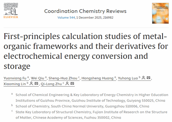 近日,化学工程学院&贵州省高等学校能源化学特色重点实验室符远翔副教授研究团队,与华南师范大学罗玉红副研究员和林晓明教授以及中国科学院福建物质结构研究所国家级人才朱起龙研究员等人合作,在关于第一性原理计算预测金属有机框架及其衍生物的储能应用发表前沿性研究综述文章,相关成果《First-principles calculation studies of metal-organic frameworks and their derivatives for electrochemical energy conversion and storage》在国际权威期刊《Coordination Chemistry Reviews》(中国科学院1区TOP期刊,影响因子(IF=23.5)上发表。贵州理工学院为第一单位,符远翔为第一作者,黄宏升教授和仇伟副教授为共同作者,罗玉红、林晓明以及朱起龙共同担任本文的通讯作者。该工作为符远翔研究团队在2025年发表的第三篇储能方面的重要成果。前两篇分别为《Materials Today Communications 2025, 46, 112534》(中国科学院3区,IF=4.3),《Journal of Colloid and Interface Science 2025, 683, 507》(中国科学院1区TOP期刊,IF=9.7)。