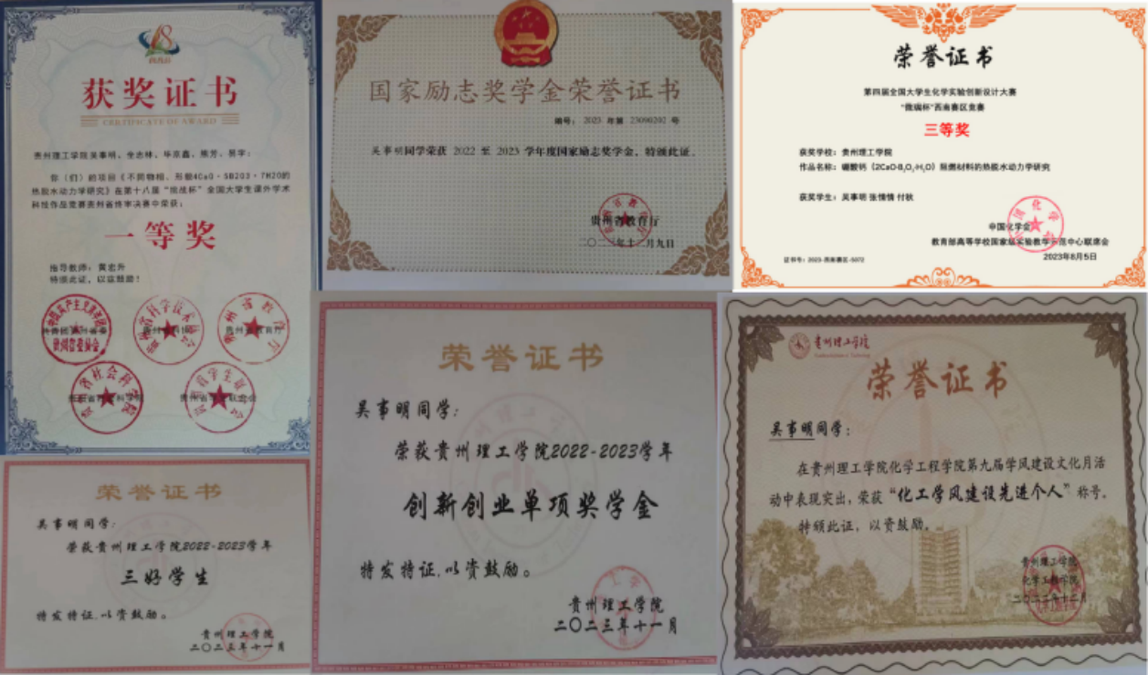 科研的生活总是充满激情与挑战,需要保持良好的心态来面对。经过这三年的实验室学习与锻炼,我对科研产生了浓厚的兴趣,寻找到自己的奋斗目标,也实现了我当初进入实验室的心愿,我的综合能力也得到较大提升。在此期间,我主持了国家级创新创业项目1项;熟练掌握了Endnote、 E-study、X-mol、Elsevier、Gsas、Jade、origin、Figdraw 等文献查阅、管理和科研分析、数据库、画图软件,基本能独立进行实验设计、结果分析(XRD、SEM、TEM、SAED、TG-DTA/DSC)、谱图绘制和论文初稿的撰写,自学了热分析动力学的研究原理和计算方法,结晶动力学和吸附动力学相关的理论知识和计算方法;以第一作者、第二作者身份发表SCI(二区)论文2篇,在投SCI论文1篇,在撰写英文论文1篇;获第十八届“挑战杯”全国大学生课外学术科技作品竞赛获省级一等奖,第十四届“挑战杯”贵州省大学生创业计划竞赛获省级优秀奖,第四届全国大学生化学实验创新大赛获西南地区三等奖等省级学科竞赛奖;以本科生的身份参加中国化学会第八届全国热分析动力学与热动力学会议并投稿会议论文1篇;本科毕业论文获优秀毕业论文。另外,我还获得了国家励志奖学金、校级单项奖学金、校级三好学生、化工学风建设先进个人、优秀班主任助理等荣誉称号,并顺利考入云南民族大学继续攻读硕士学位。