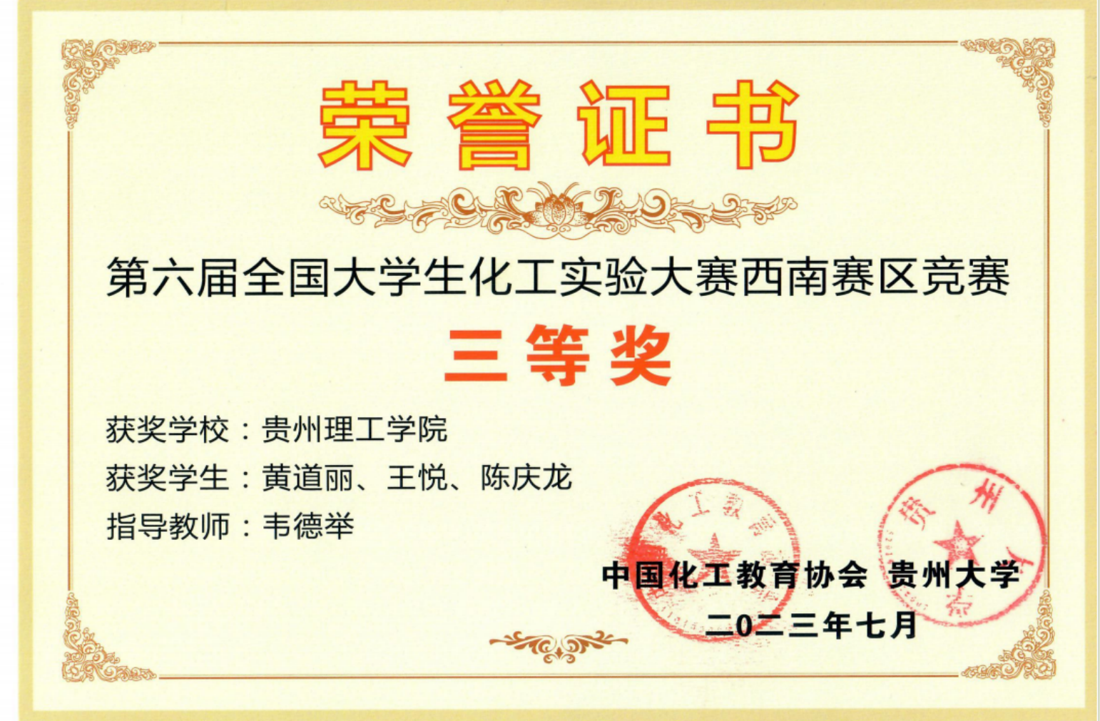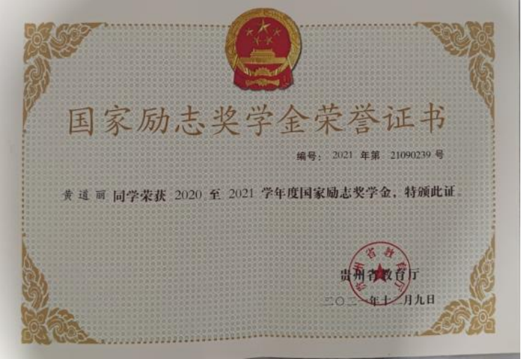 黄道丽,2020级化学工程与工艺,化工201班,现考入桂林理工大学继续攻读硕士学位。在校期间,连续三年获得国家励志奖学金、校三好学生,获第六届全国大学生化工实验大赛西南赛区三等奖,大学生创新创业项目主持人,曾获校级优秀共青团干部、优秀学生干部;英语四级474分。