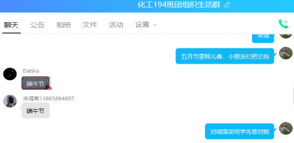 为了让化工194的同学们可以更好的了解传统文化并弘扬优秀的传统文化,六月九日早上十点,化工194的团支部在QQ群里开展一场猜灯谜的活动。此次活动化工194班的同学们积极参与,由刘琰林同学主持本次的猜灯谜活动。