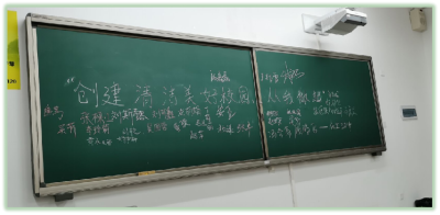 活动已经接近尾声,班委组织全班同学进行了“创建清洁美好校园,从我做起”的签名活动,各位同学纷纷做出承诺,并在黑板上庄重的签下自己的名字。