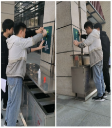班长丁芃林带领班级同学为宣传环境保护在食堂门口发放垃圾分类宣传单,以及张贴垃圾分类海报。以便提醒学生们进行垃圾分类,增强环境保护意识。