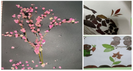 同学们利用落叶,落花等自然物进行画幅创作,展示手工创意作品,让大家意识到环境保护的重要性。