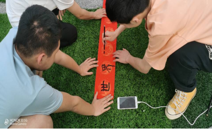 同学们五人组队写对联。一副对联仅仅有12个字,却表达了向党的决心。他们是互帮互助彼此相容的关系,表达了了我们爱国情怀。