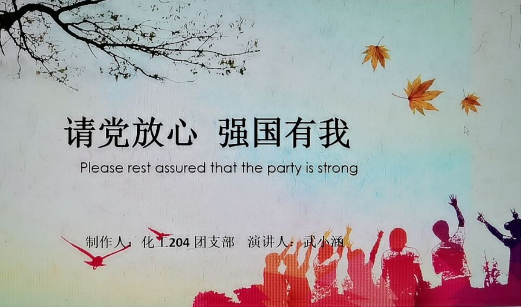 最后,大家用自信且斗志昂扬的声音向党宣誓:“这盛世终将如吾辈之所愿,不负先者之所托,吾辈必将捍卫祖国山河,将其至千秋万代而不衰!”