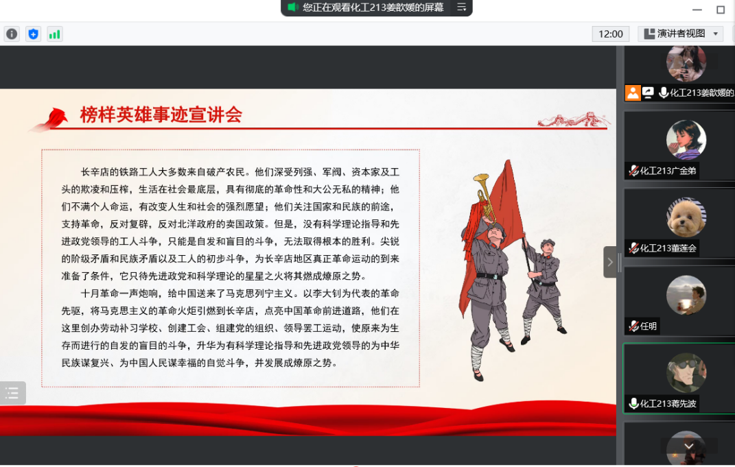 传承红色基因,赓续红色血脉,接棒时代新人,化工213班团支部于2022年9月7日组织同学们开展以“赓续红色血脉,培育时代新人”为主题的团组织活动。受疫情影响,本次活动选择在线上开展,由团支部书记姜歆媛主持,化工213班全体同学参加。
