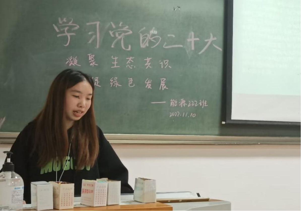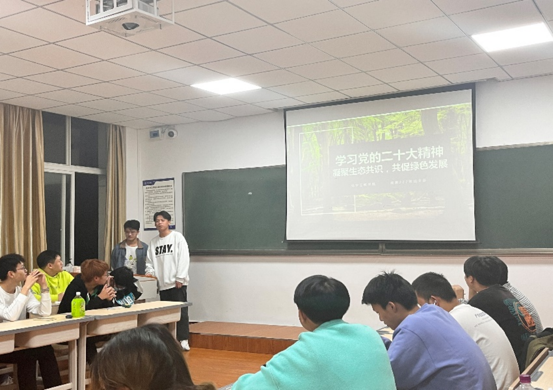 为了响应校团委的号召,化学工程学院能源222班于11月10号在蔡家关校区二教309教室开展了以“学习党的二十大精神——凝聚生态共识,共促绿色发展”为主题的团组织生活,提升同学们保护环境的意识,共创美好生活。