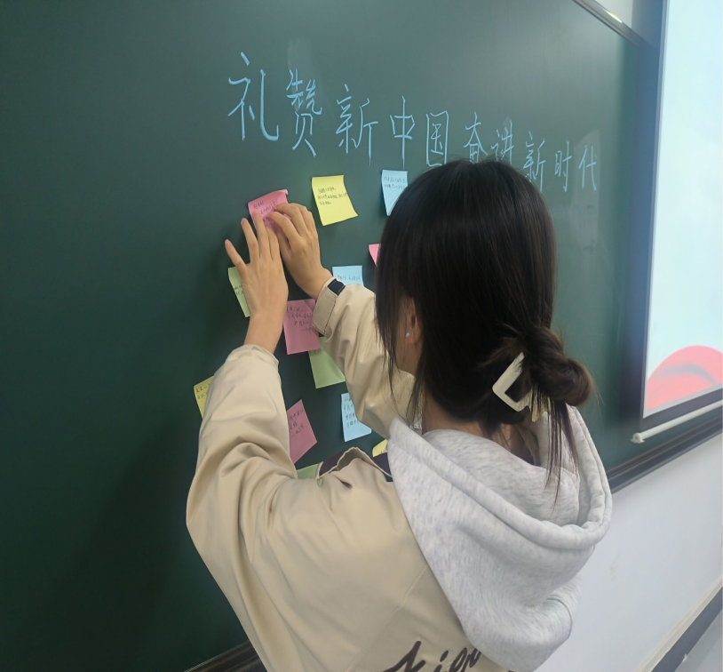 最后全班同学合唱《没有共产党就没有新中国》。向祖国表达他们的祝福和爱意,希望祖国越来越美好。同学们在便利贴上写下对祖国的祝语,祝伟大的祖国大步朝前走,祝福祖国繁荣昌盛!