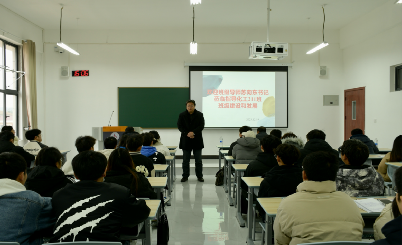为帮助同学们坚定理想信念,明确自身发展方向,做好职业发展规划,2023年12月19日,化工211班在B01-409教室召开了“坚定理想信念,成为高技能创新型人才”的主题班会。校党委书记、班级导师苏向东,化学工程学院党总支书记宋明江,副书记蔡诚,班主任张红燕等参加了本次主题班会活动。