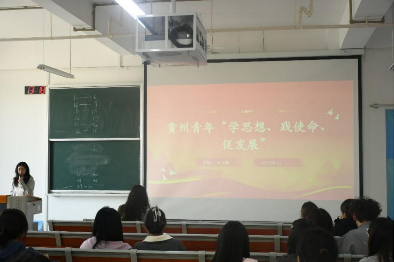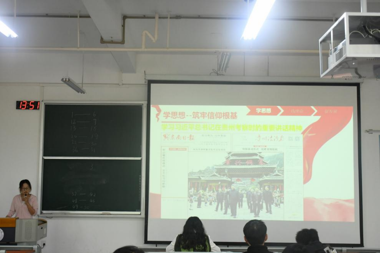 活动开场,赵之楠同学从习近平新时代中国特色社会主义思想出发,把“青年是未来希望、青年勇担时代使命、为青年创造良好环境”与自身社会实践经历相结合,得出自己的见解:青年应主动投身贵州经济社会发展大局,在乡村振兴、科技创新、生态保护等领域贡献力量,展现出新时代青年的责任与担当。