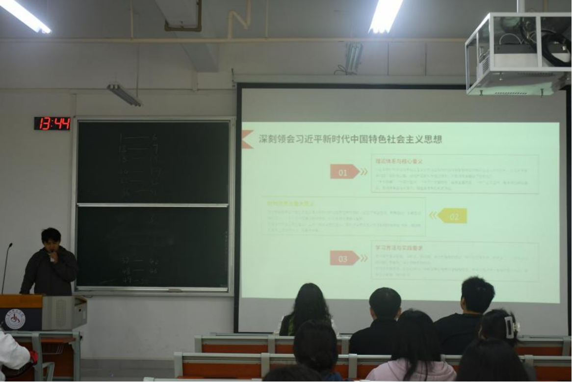 韩田鑫同学则以自身学习经验分享筑牢对习近平新时代中国特色社会主义思想的信仰根基,又以当代青年在贵州现代化建设中展现责任担当的各种事迹,谈到当代青年该以此来勇于践行使命,彰显青春担当。罗昌利、杨敏两名同学分享了学思想的重要性、践使命的必要性、促发展的意义,结合自身社会实践经历,深刻领悟了“两个确立”的决定性意义,同时以自身情况为例,分享自己参加大学生社会实践的经验,在社会实践中彰显学生党员的奉献精神。