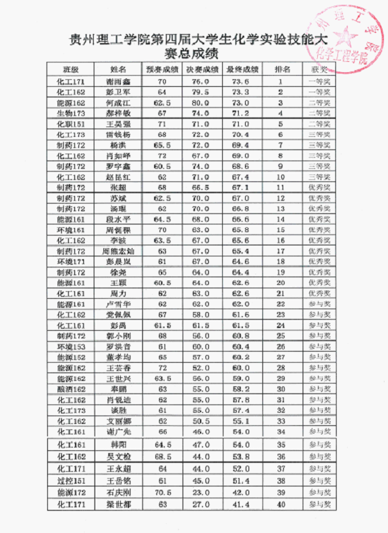 贵州理工学院第四届大学生化学实验技能大赛结果公示公告