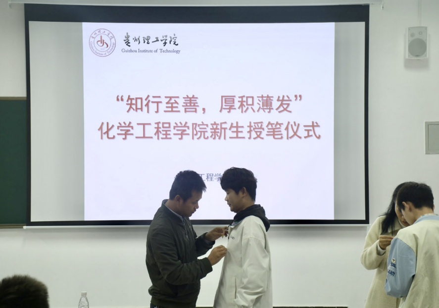 第二项:各班班主任为同学们介绍授笔仪式的目的及意义,学生发表个人立志宣言,并递交承诺书。教师收下承诺书,为学生佩戴校徽,授笔,赠桌牌,合影。佩戴校徽:接收成为贵州理工化工学院一员。授笔:提出希望履行承诺,坚定志向,脚踏实地,求真学问,练真本领。赠桌牌:提出希望,时刻以饱满精神状态亮明身份。同学们用激昂的声音道出对未来的憧憬与向往,更加坚定自己能够有所作为的信心!