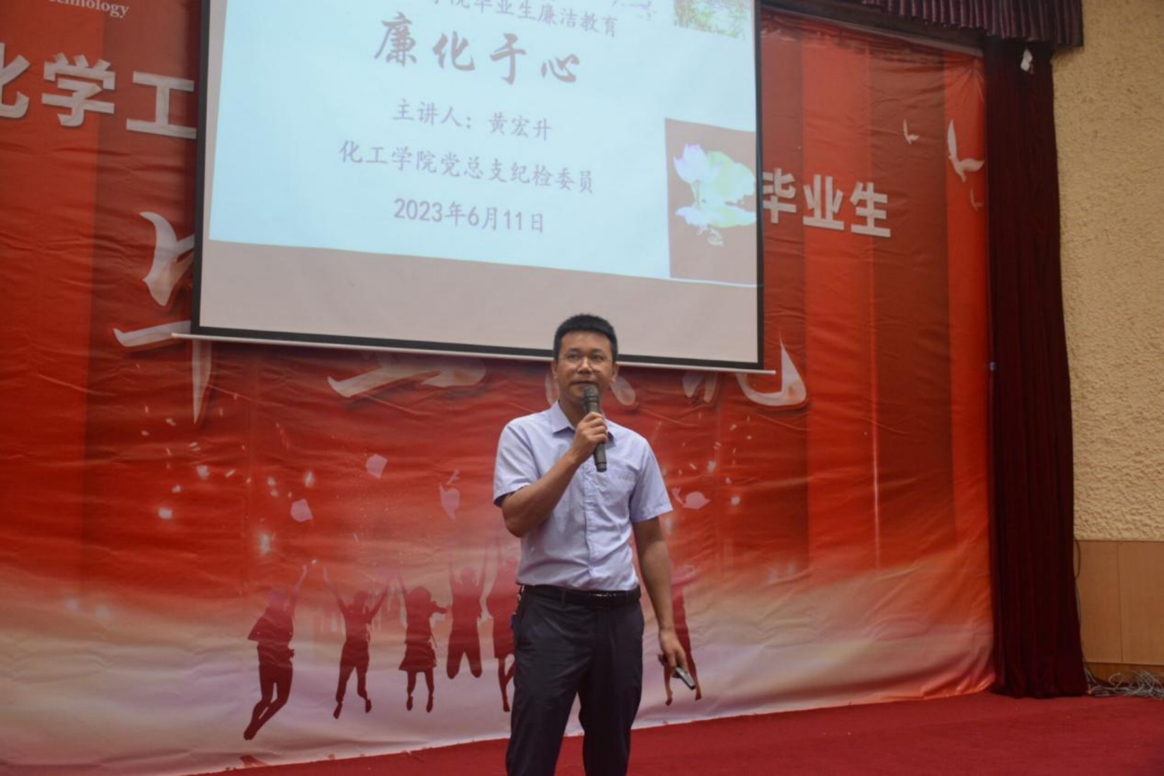 2023年6月11日上午,化学工程学院副院长、学院党总支纪检委员黄宏升在逸夫小礼堂向2023届毕业生开展了廉洁教育,这是母校对于毕业学子们的嘱托,也是化学工程学院教导他们的最后一课,更是大家迈入社会前的重要一课。