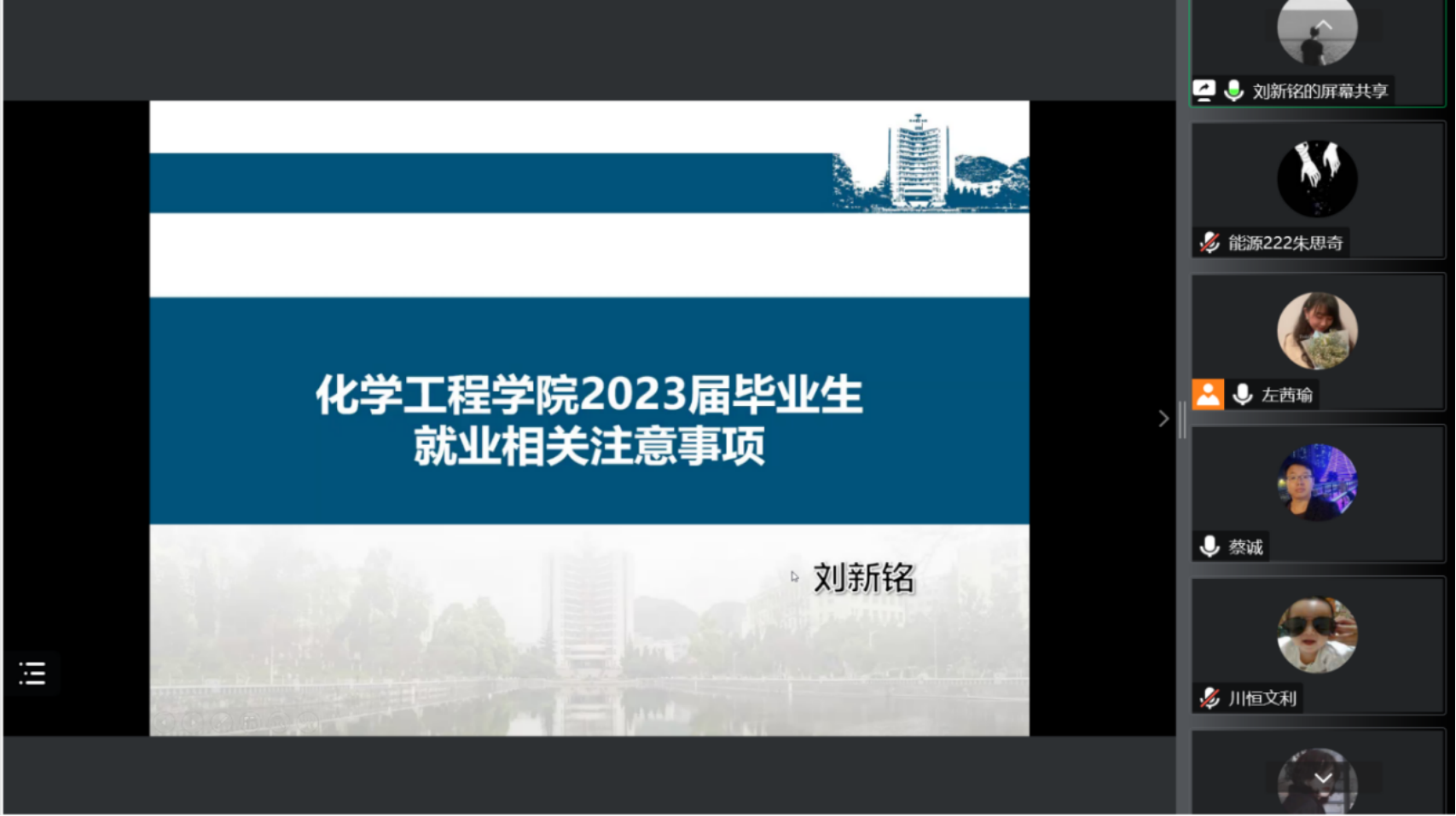 化学工程学院于2022年10月9日召开2023届毕业生就业启动大会暨川恒集团线上宣讲会。按照疫情防控要求,本次会议通过线上的方式举行。川恒集团人力资源总监文利,化学工程学院院长唐安江、党总支副书记蔡诚、学生科副科长刘新铭、以及2019级全体学生及班主任参加了本次大会。