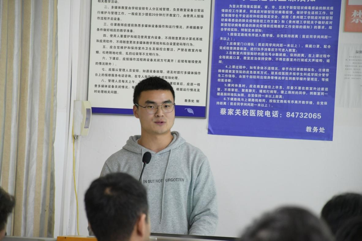 为进一步加强过控学子们对研究生入学考试的认识,了解前沿的就业形势、增强考研斗志。4月22日晚19:00,化学工程学院于3-114D教室开展过程装备与控制专业考研交流会。参加会议的有:化学工程学院党总支副书记蔡诚、过程装备与控制教研室主任吴其俊老师、学生科副科长刘新铭、辅导员左茜瑜以及化学工程学院2019级、2020级过控专业全体学生。