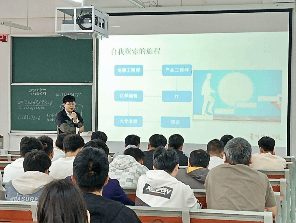 他提醒大家,职业选择并非一成不变,而是需要随着个人成长和环境变化进行适时的调整;在自我探索的旅程部分,他分享了自我认知的过程,包括自我评估、目标设定和方向确认等步骤。他以自己的专业为例,鼓励学生们通过实践和学习来不断丰富自我,探索可能的职业道路。