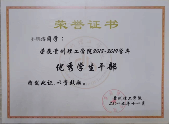 (1)个人在校期间学习及学生工作经历:在校期间担任过化工183班班长,获得校级优秀学生一等奖学金,多次荣获贵州理工学院三好学生、优秀学生干部、文体积极分子等荣誉称号。