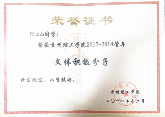 (1)个人在校期间学习及学生工作经历:在校期间担任化工162班班长,学习认真,工作负责,积极促进班级班风、学风建设,多次荣获贵州理工学院军训优秀学员、优秀学生干部、文体积极分子、学风建设先进个人等荣誉称号。