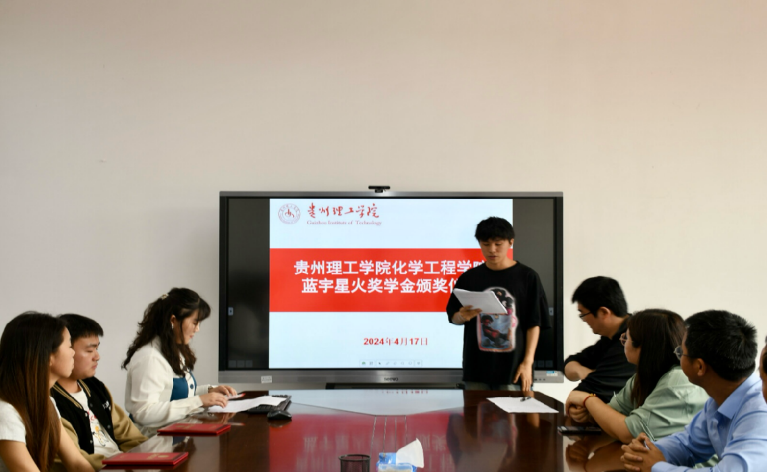 2024年4月17日,贵州理工学院化学工程学院“蓝宇星火奖学金”颁奖仪式在酝知楼539会议室举行。浙江蓝宇数码科技股份公司人事经理朱俏萍,化学工程学院党总支书记宋明江、副院长黄宏升出席了颁奖仪式。