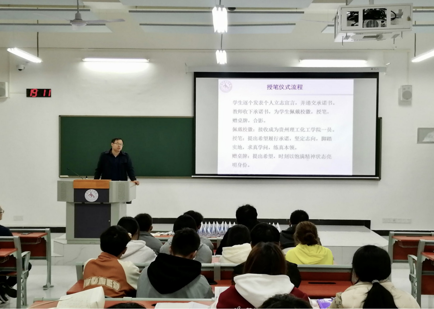 第二项:各班班主任为同学们介绍授笔仪式的目的及意义,学生发表个人立志宣言,并递交承诺书。教师收下承诺书,为学生佩戴校徽,授笔,赠桌牌,合影。佩戴校徽:接收成为贵州理工化工学院一员。授笔:提出希望履行承诺,坚定志向,脚踏实地,求真学问,练真本领。赠桌牌:提出希望,时刻以饱满精神状态亮明身份。同学们用激昂的声音道出对未来的憧憬与向往,更加坚定自己能够有所作为的信心!