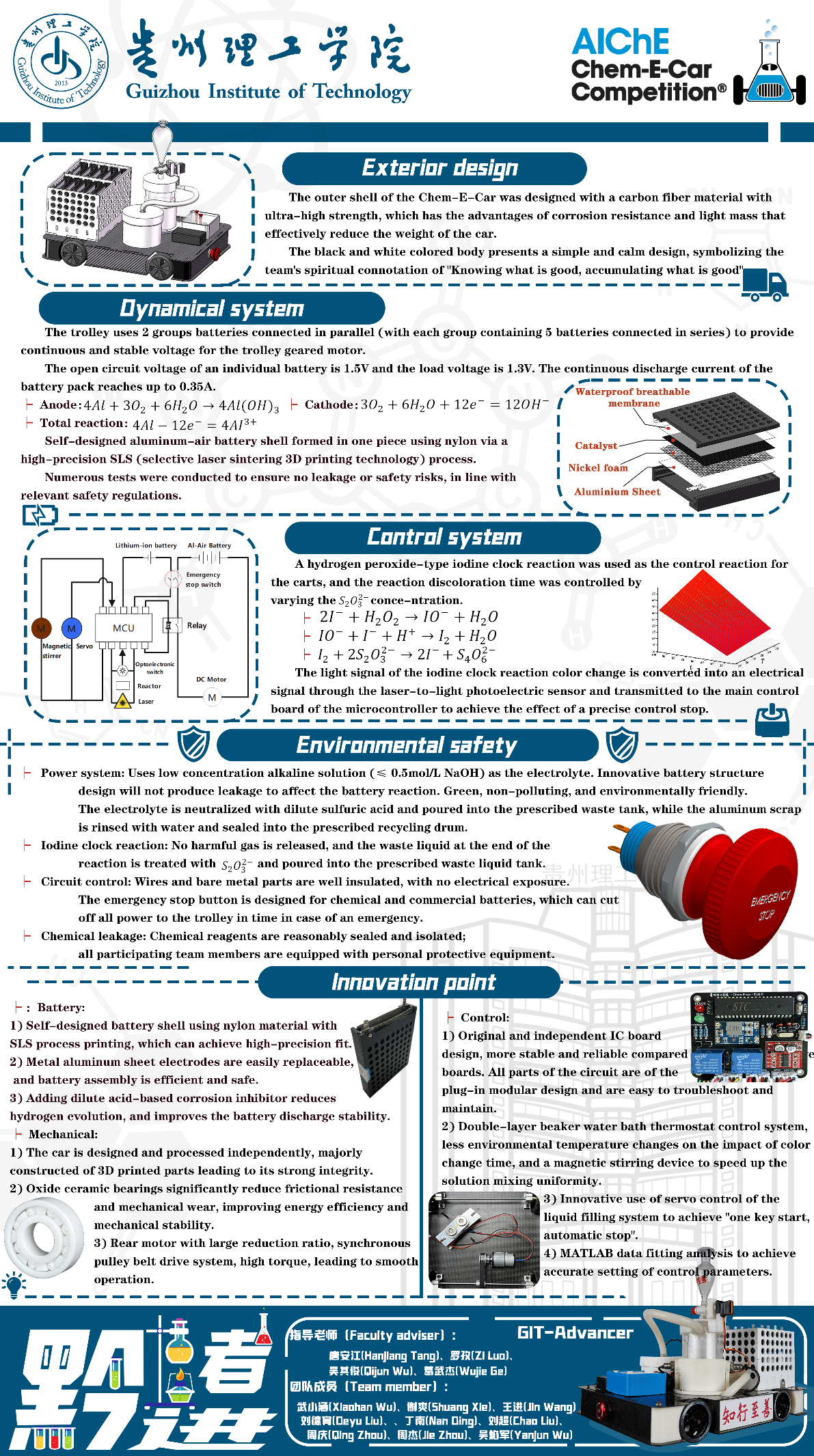 作为最年轻的参赛学校,贵州理工学院能够顺利完成Chem-E-Car队伍组建与小车制作,得益于化学工程学院在“新工科”专业建设上的思考与探索。参赛队员分别来自“化学工程与工艺”、“新能源科学与工程”、“过程装备与控制工程”专业,他们在各自的专业实验室中得到了系统的学术技能训练,最终在短时间内融合为一个成功的多学科背景团队,学会了利用专业知识与工具解决多条件约束下的复杂工程问题,为将来踏入行业成为卓越的工程师打下坚实基础。