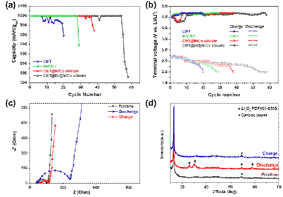 针对这些问题,我院李自卫老师与东国大学Kang Yongmook教授课题组提出,把具有高催化剂活性的镍钴硅酸盐包覆在具有高导电能力的碳纳米管表面,形成核壳型催化剂,减少碳纳米管与电解液直接接触,从而抑制碳酸锂等副产物的生成。并通过将镍钴硅酸盐部分还原出金属镍,进一步提高材料的整体电子传输能力。得到的碳纳米管@镍@镍钴硅酸盐核壳催化剂的放电容量达到10046 mAhg-1cat,循环次数达54次。该研究工作发表在材料化学A杂志上(J. Mater. Chem. A, 6, 10447-10455,2018.),影响因子8.867。