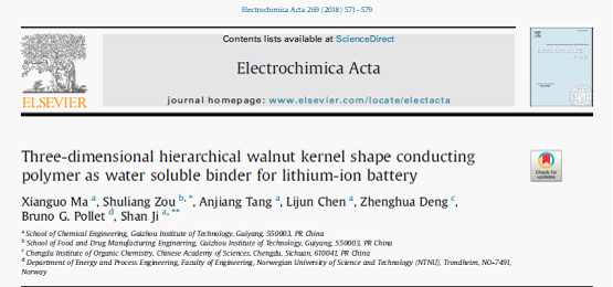 Xianguo Ma, Shuliang Zou, Anjiang Tang, Lijun Chen, Zhenghua Deng, Bruno G. Pollet, Shan Ji,Three-dimensional hierarchical walnut kernel shape conducting polymer as water soluble binder for lithium-ion battery;Electrochimica Acta 269 (2018) 571-579; DOI:10.1016/j.electacta.2018.03.031. https://www.sciencedirect.com/science/article/pii/S001346861830519X