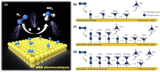 图2电催化氮还原产氨反应(a)反应过程示意图(b-d)主要反应机制