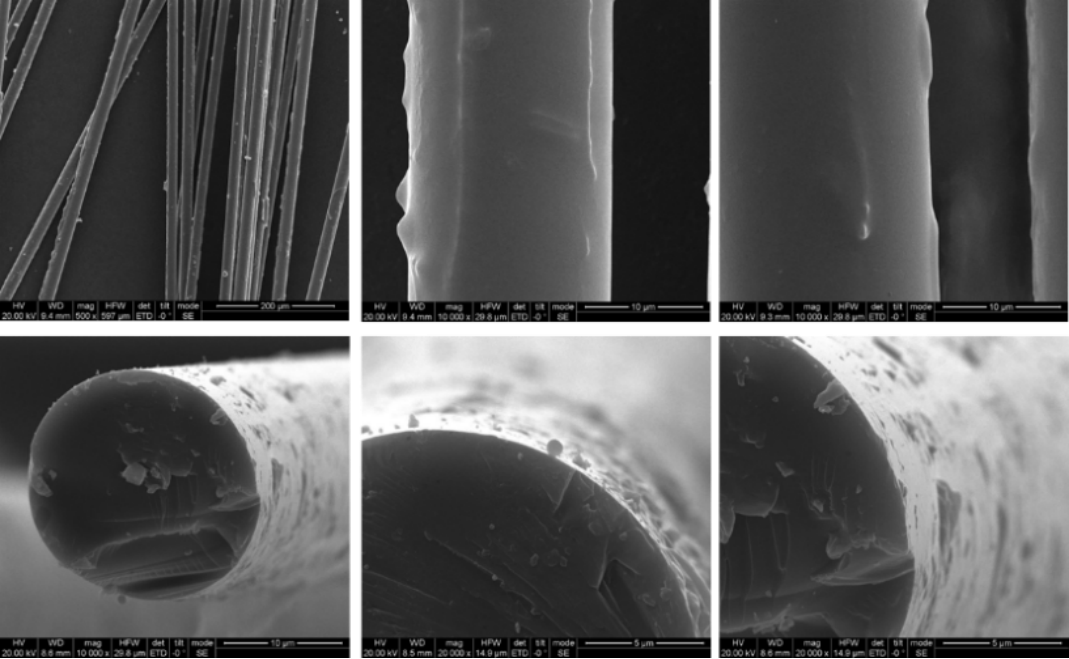 图9改性机理及经改性浸润剂拉制的玄武岩纤维原丝SEM图